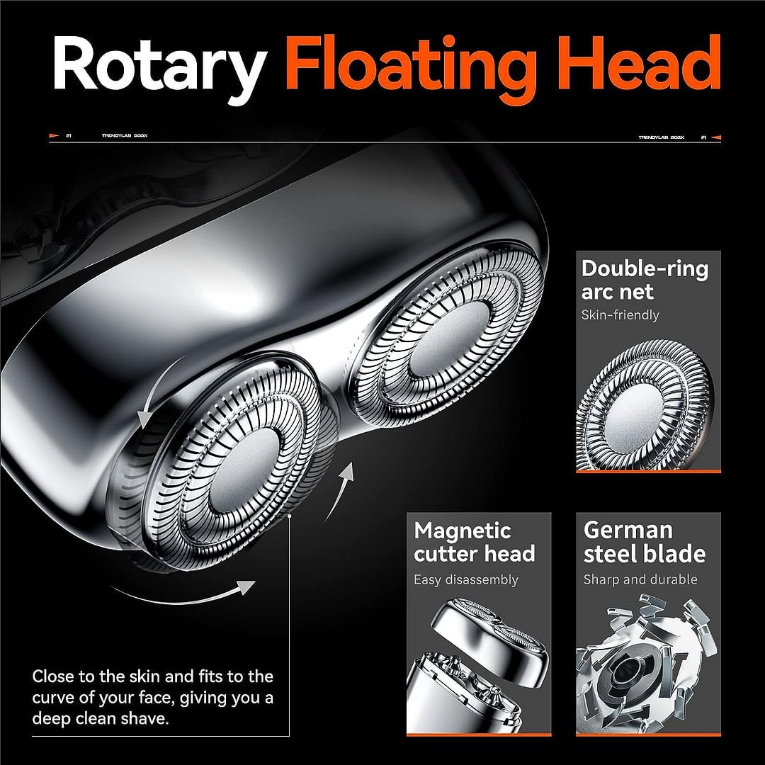 Scherp roestvrijstalen wervelmes, gespecialiseerd in harde baarden, 0,1 mm dunne roestvrijstalen folie, dubbele ring 3D-mesnet, vergroot het scheervolume, maakt het zwevende boogoppervlak glad en verwijdert het haar van je huid.