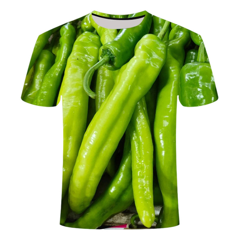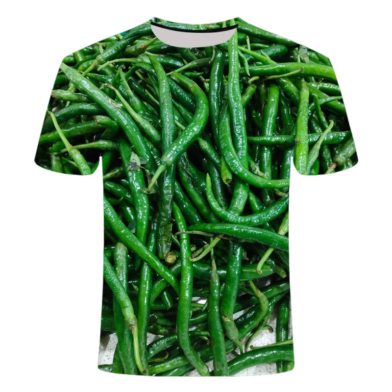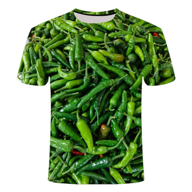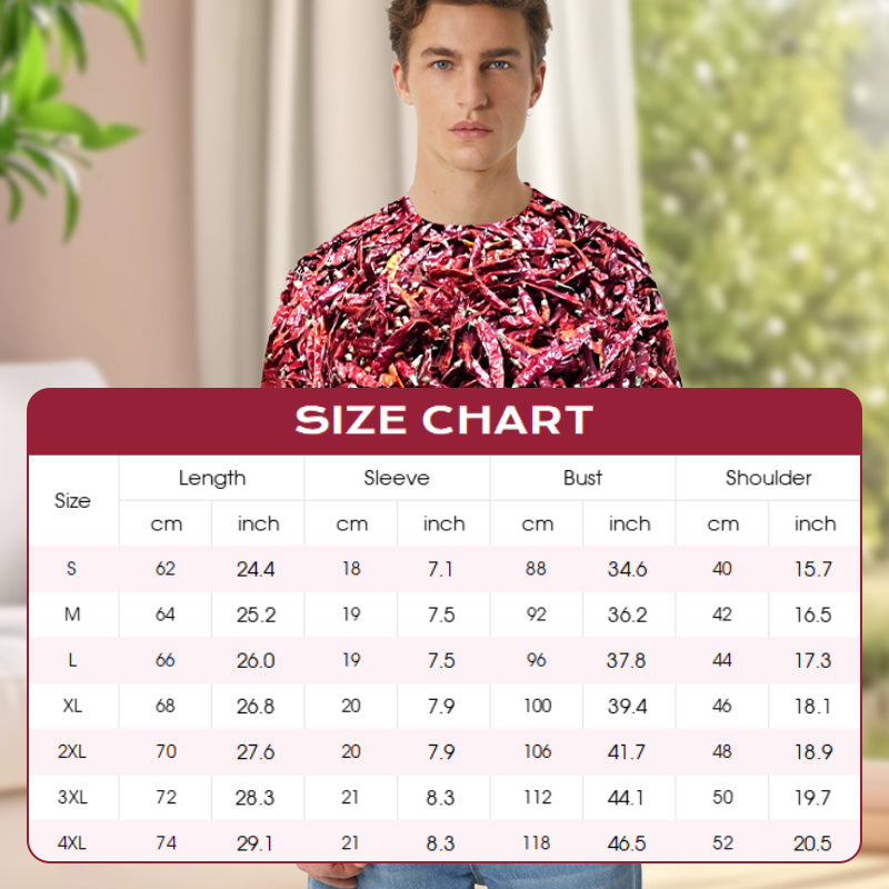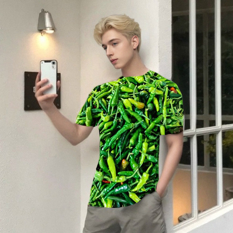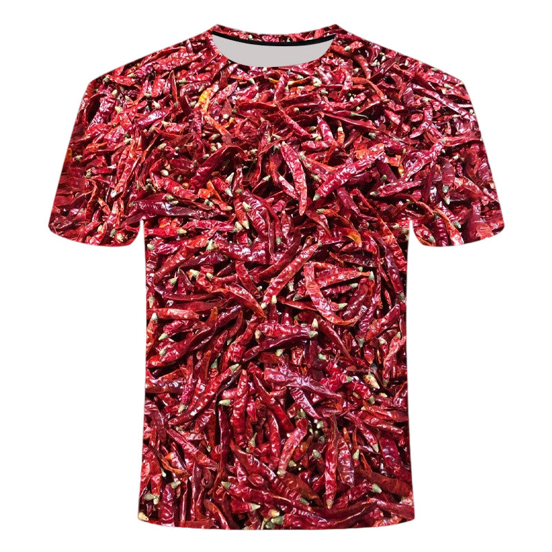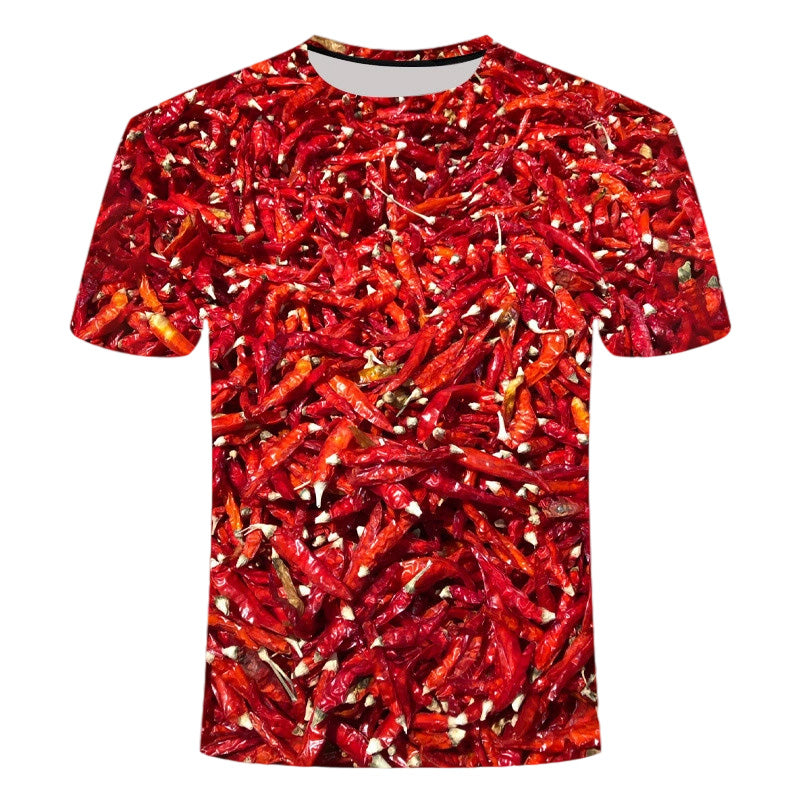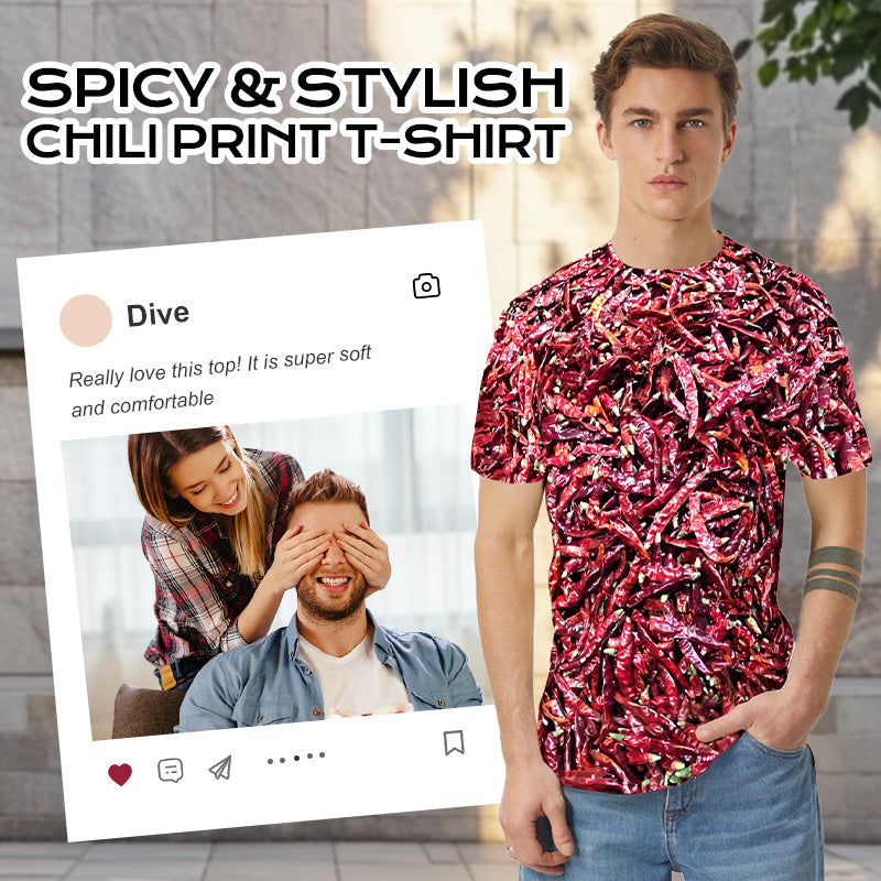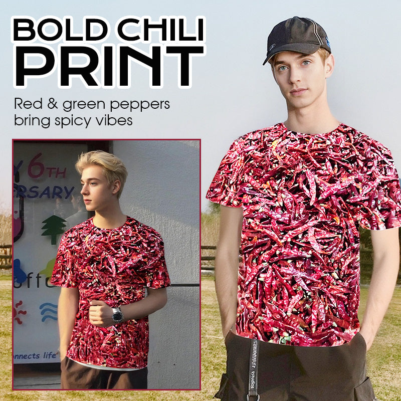 SPICY STYLE STATEMENT: Zet de boel op scherp met dit speelse rode en groene chili-print dat een vurige twist geeft aan elke casual outfit. Een must-have voor pittigheidsliefhebbers en fashionliefhebbers met een unieke smaak!