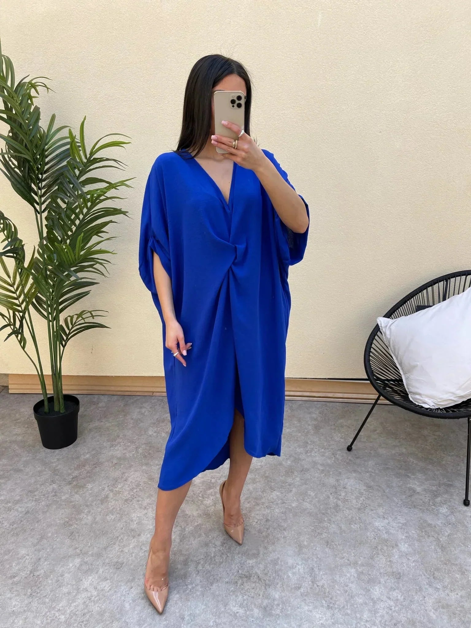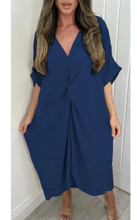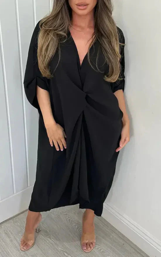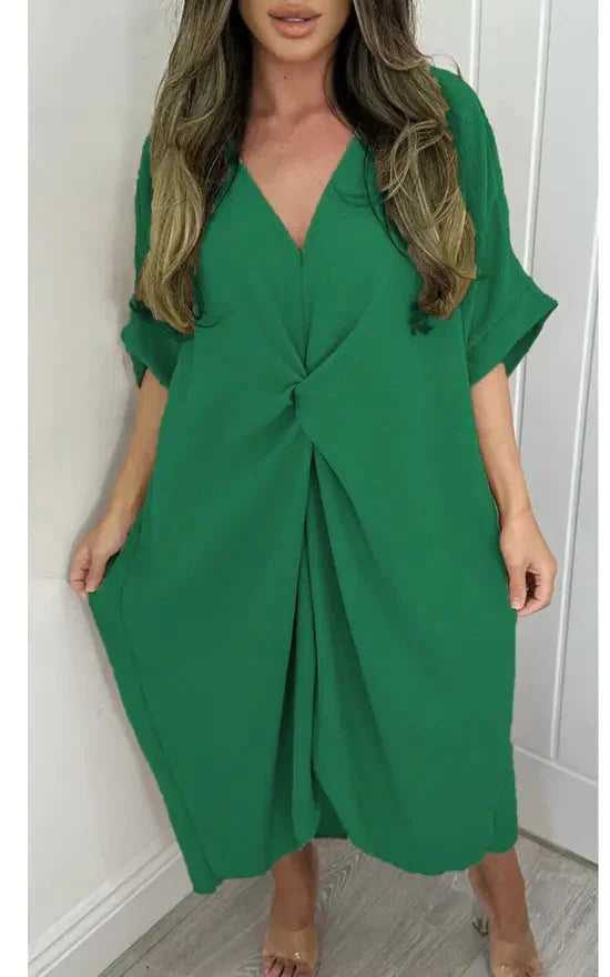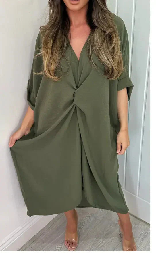 Stap in moeiteloze elegantie met onze maxi-jurk met korte mouwen en knoopdetail. Deze jurk is ontworpen om zowel comfort als stijl te bieden, waardoor het een veelzijdige aanvulling is op je garderobe.