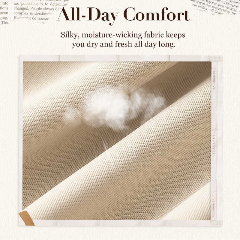 VOCHTAFVOEREND EN ADEMEND MATERIAAL – Gemaakt van zijdezacht, ademend materiaal dat vocht afvoert en je de hele dag fris en droog houdt. Het hoogrekbare materiaal vormt zonder comfort te verliezen – zelfs bij langdurig dragen.